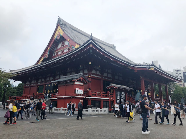 Senso-ji est le plus vieux temple bouddhiste de Tokyo (il fut fondé plus de 1 000 ans avant la naissance de Tokyo), situé dans le quartier d'Asakusa, au bord de la rivière Sumida. Quand on arrive là-bas, on tombe d'abord sur la porte Kaminarimon (elle est tellement grande qu'on ne peut pas la rater), qui débouche sur une longue allée marchande, appelée Nakamise-dori, qui concentre un grand nombre de petites boutiques de souvenirs et stands de nourriture. On ne s'est même pas arrêté dans cette allée, car ce n'était pas trop ce qui nous intéressait.